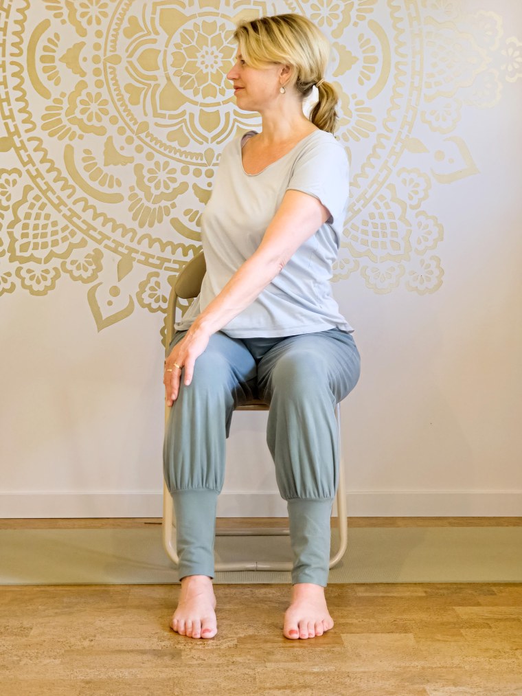 “Stoelyoga is een fijne vorm van yoga omdat je de stoel kunt gebruiken bij staande oefeningen mocht het nodig zijn. En zittend is het erg fijn om zo toch yoga te kunnen beoefenen.